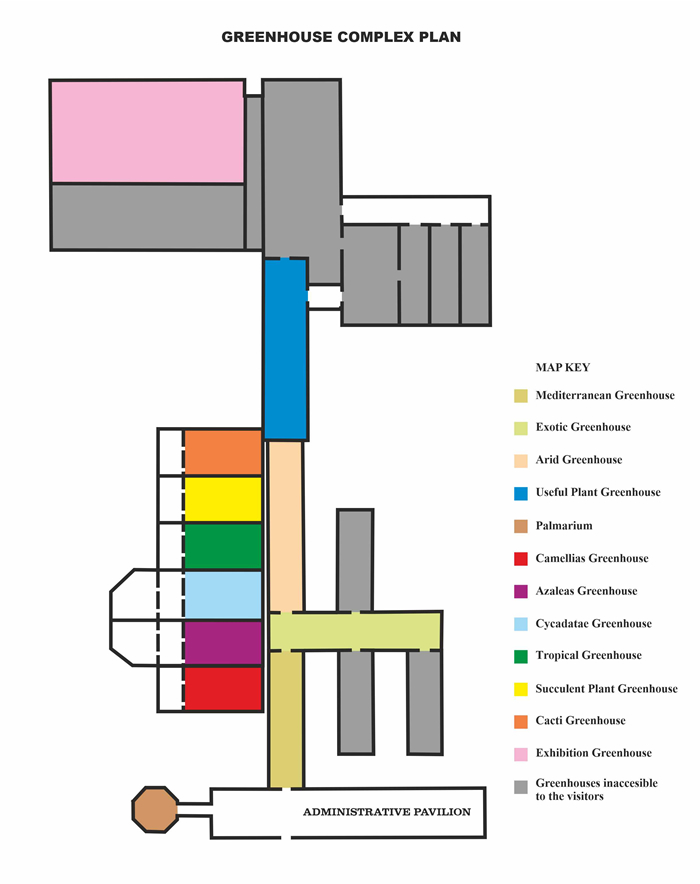The Greenhouse Complex is located in the central area of the Ornamental sector, occupies an area of 5500 m² and comprises 21 compartments. Of these, 8 are permanently open for visits, and another 3 are accessible to visitors at certain times of the year, on the occasion of various exhibition events.