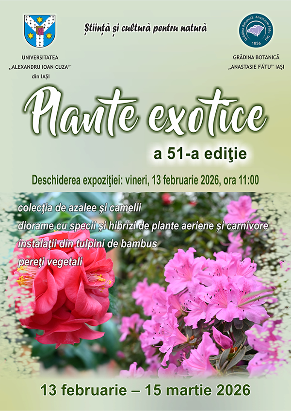 Cea de-a 51-a ediţie a Expoziţiei de plante exotice este organizată în compartimentele Complexului de Sere, începând cu ziua de 13 februarie, orele 11.00, până în ziua de 15 martie 2026, orele 17.00.