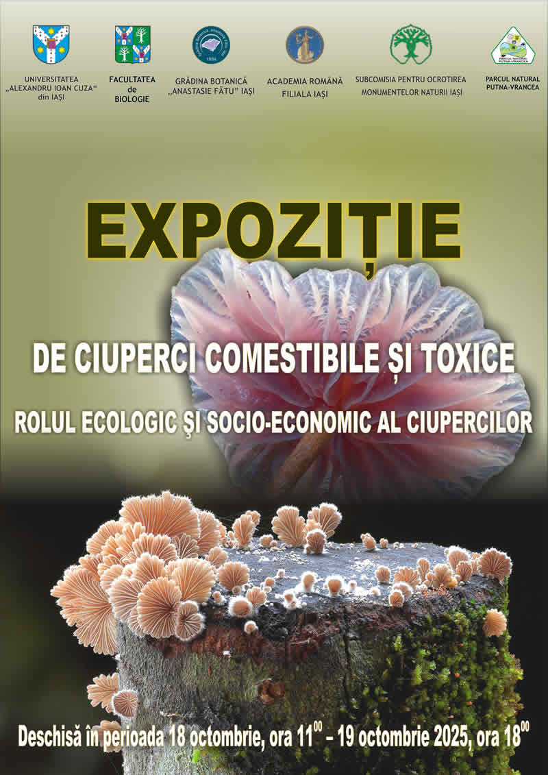 Specialişti de la Grădina Botanică şi din cadrul Laboratorului de Cercetare a Fungilor de la Facultatea de Biologie a Universităţii „Alexandru Ioan Cuza” din Iaşi, în colaborare cu administraţia Parcului Natural Putna-Vrancea, Secţia de Ştiinţe Biologice şi Comisia pentru Ocrotirea Monumentelor Naturii din cadrul Academiei Române, organizează începând de sâmbătă, 18 octombrie 2025, ora 11.00, până duminică, 19 octombrie 2025, ora 18.00, expoziţia anuală cu specii de ciuperci comestibile şi toxice, colectate din habitate forestiere ale Parcului Natural Putna-Vrancea, secţiile Grădinii Botanice, pădurile din împrejurimile municipiului Iaşi, dar şi din zona montană a judetelor Neamţ şi Suceava.